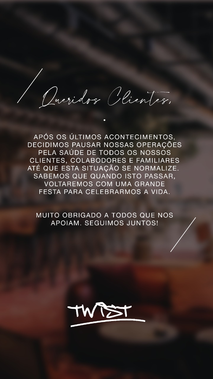 O Twist Bar, tradicional restaurante da capital inaugurado em 2003, anunciou na tarde desta sexta-feira que irá suspender as atividades até que a pandemia do novo coranavírus seja normalizada. Segundo 0 comunicado, a medida foi adotada para preservar a vida dos clientes e colaboradores da empresa.