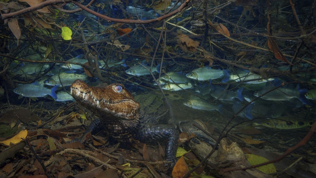 O jacaré-coroa imóvel em meio ao cardume de corimbas (Márcio Cabral)