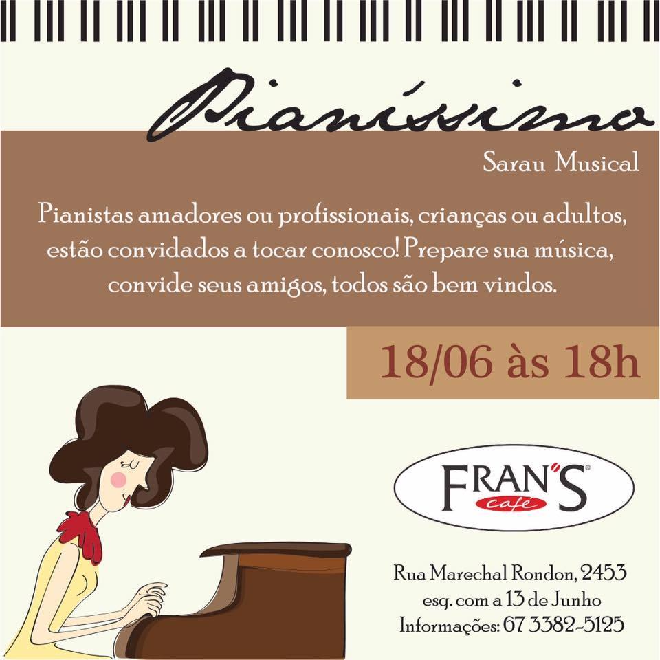 A quantidade de talentos na cidade é tanta, que o Fran’s Café resolveu celebrar os “instrumentistas” que fazem as mais belas notas saírem dos próprios dedos. Então, para compartilhar música de todos os estilos, idades, para amadores ou profissionais, às 18h deste sábado (18), acontece o Pianíssimo Sarau Musical.