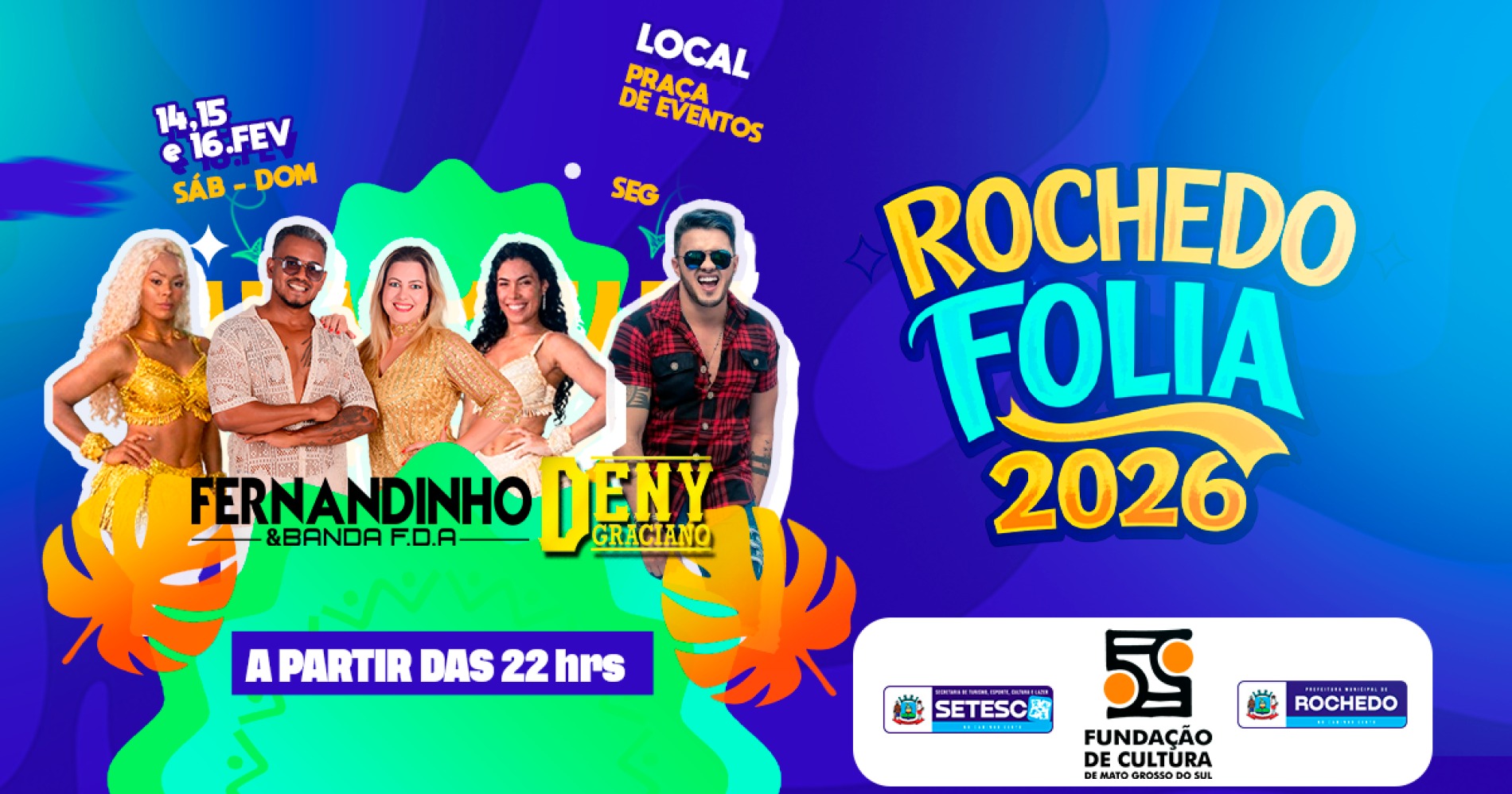 O Rochedo Folia 2026 conta com o importante apoio da Fundação de Cultura de Mato Grosso do Sul, da Secretaria de Estado de Turismo, Esporte e Cultura.