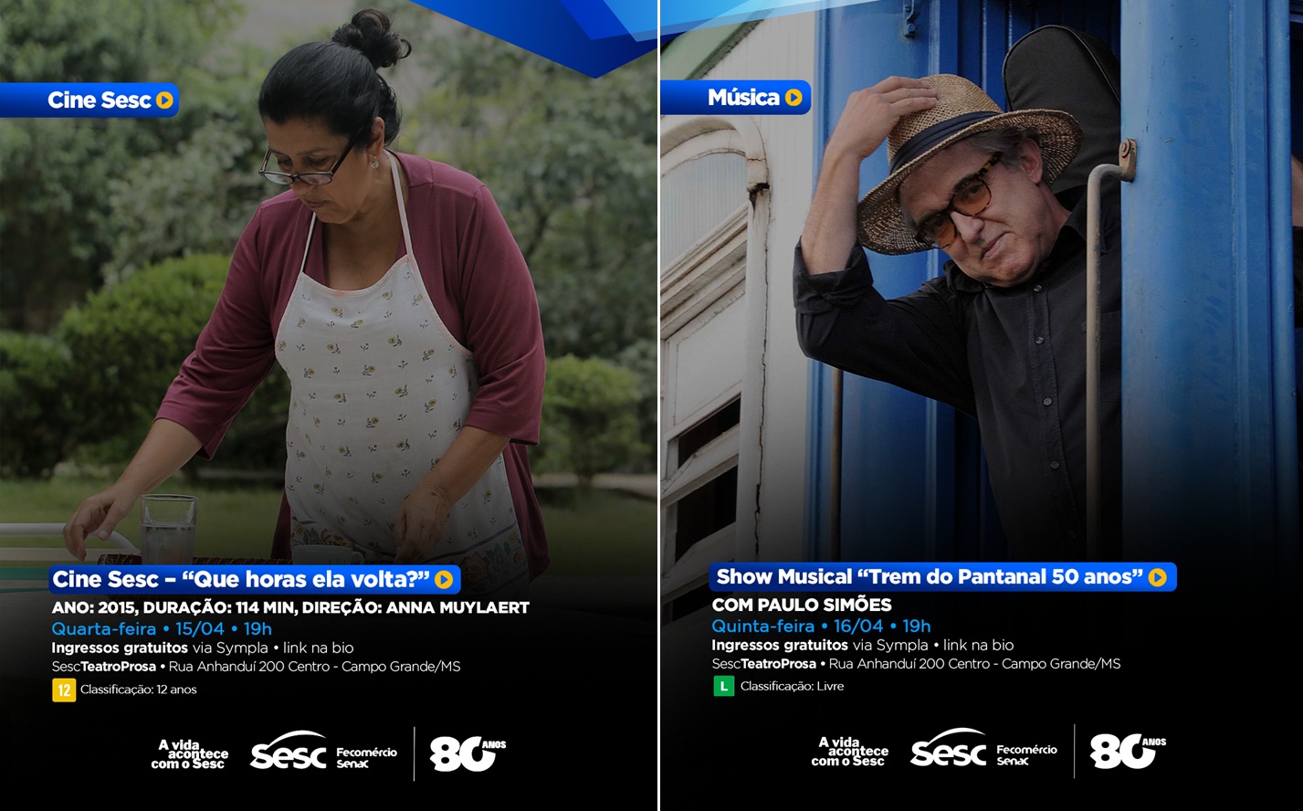 Já na quinta-feira (16), às 19h, o destaque é o show “Trem do Pantanal 50 anos”, com Paulo Simões. A apresentação celebra cinco décadas da canção “Trem do Pantanal”, composta em parceria com Geraldo Roca, um dos maiores símbolos da música sul-mato-grossense.
