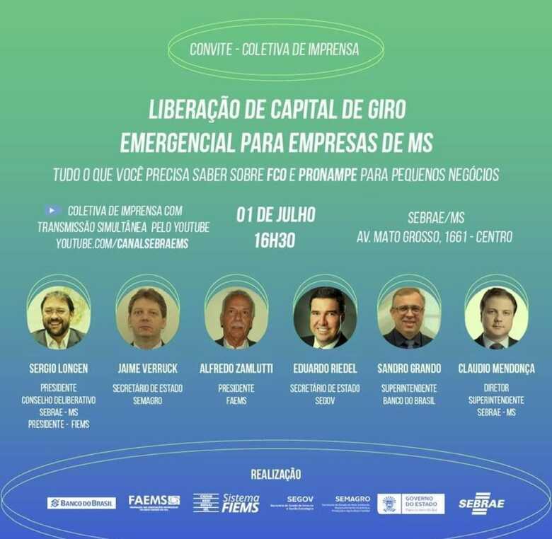 A Fiems, o Sebrae/MS, a Faems, o Banco do Brasil e a Caixa Econômica Federal anunciam, neste momento, novas linhas de crédito emergenciais para enfrentamento à Covid-19 voltadas para três mil micro e pequenas empresas de Mato Grosso do Sul. Acompanhe: