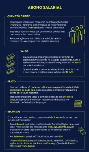 Tem direito ao benefício o trabalhador inscrito no PIS/Pasep há, pelo menos, cinco anos, e que tenha trabalhado formalmente por, no mínimo, 30 dias no ano-base considerado para a apuração, com remuneração mensal média de até dois salários mínimos. Também é necessário que os dados tenham sido informados corretamente pelo empregador na Relação Anual de Informações Sociais (Rais).