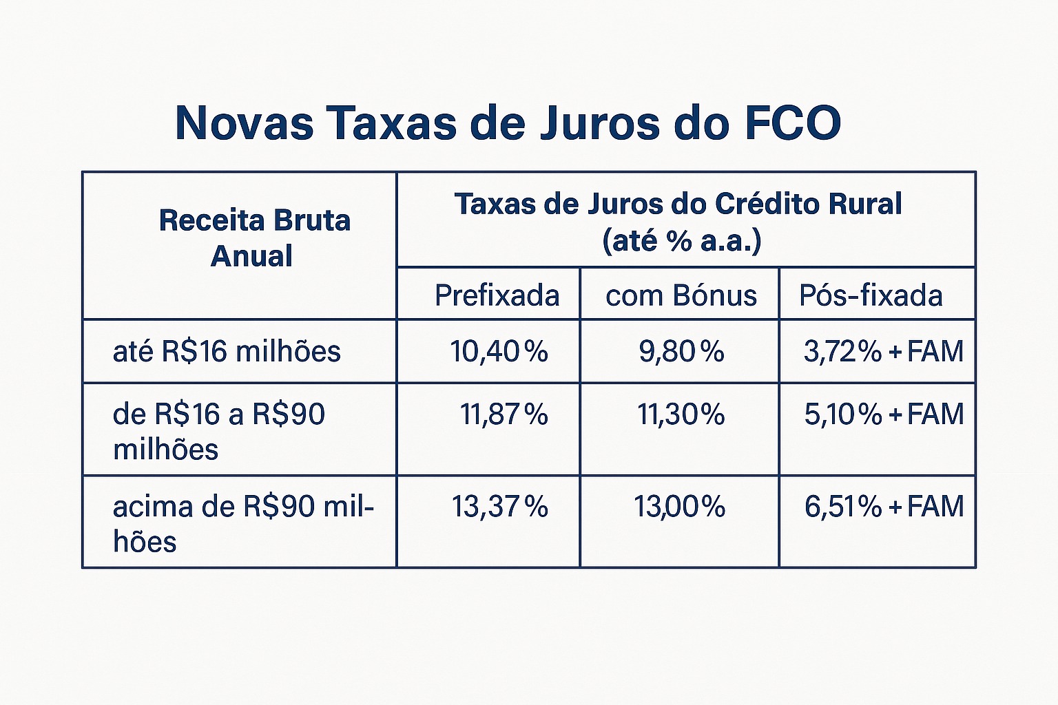 As novas taxas em vigor desde 14 de julho, serão aplicadas até 30 de junho de 2026. As novas condições visam ajustar os encargos à realidade econômica e manter a atratividade do crédito rural na região Centro-Oeste.