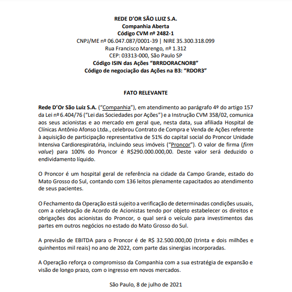 A Rede D’Or São Luiz anunciou na noite desta quinta-feira (8) a aquisição de 51% do Proncor, em Campo Grande (MS). Valor do Proncor é de R$ 290 milhões.