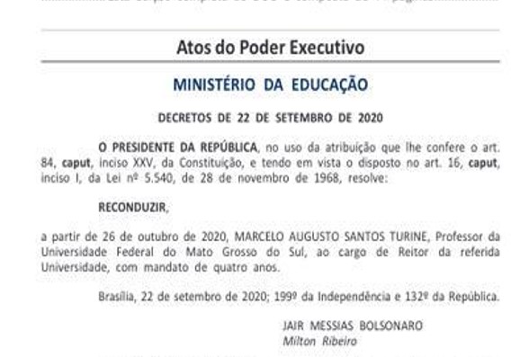 O Presidente da República, Jair Bolsonaro, nomeou o professor doutor Marcelo Turine como reitor da Universidade Federal de Mato Grosso do Sul (UFMS) para o mandato de 2020 a 2024. A decisão foi publicada no Diário Oficial da União (DOU) desta quarta-feira (23).