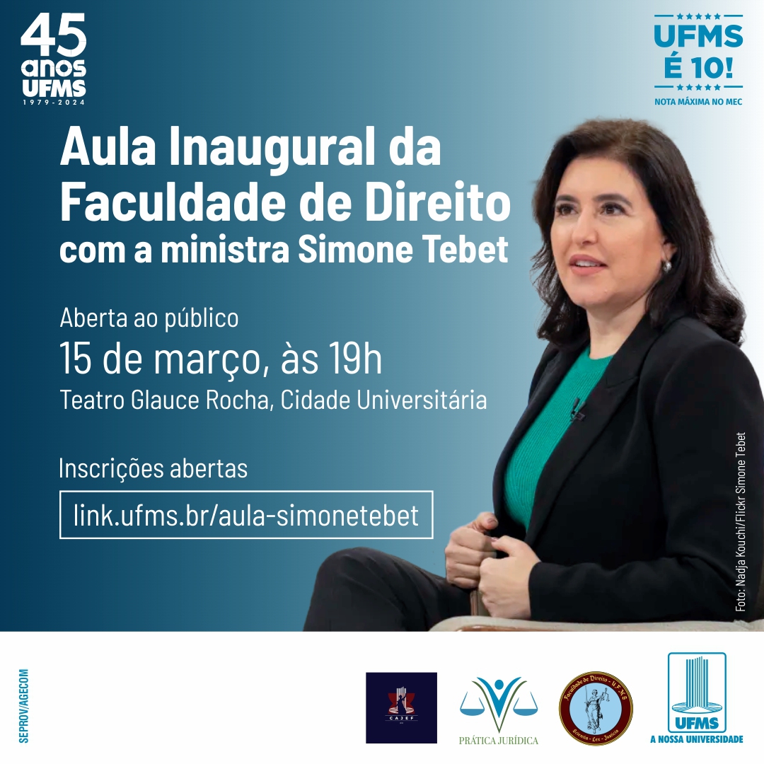 A ministra do Planejamento e Orçamento, Simone Tebet, está com viagem marcada para Campo Grande. Ela estará presente na Aula Inaugural do curso de Direito da Universidade Federal de Mato Grosso do Sul (UFMS), marcada para o dia 15 de março, às 19h, no Teatro Glauce Rocha.