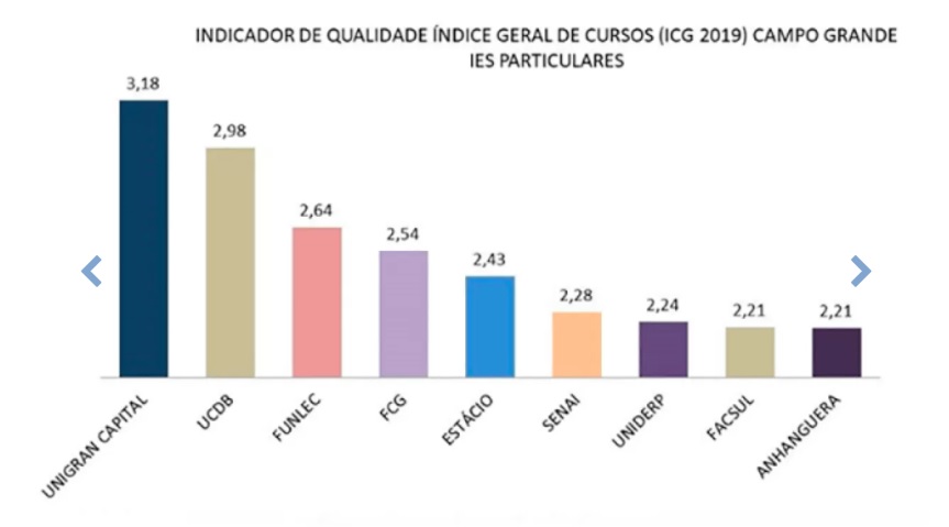 O Centro Universitário Unigran Capital se mantém, pelo quarto ano consecutivo, como a melhor Instituição de Ensino Superior (IES) privada de Mato Grosso do Sul. Os dados são do Instituto Nacional de Estudos e Pesquisas Educacionais (Inep), órgão do Ministério da Educação (MEC) responsável pela avaliação do ensino superior, que divulgou nesta sexta-feira (23), o Índice Geral dos Cursos (IGC) - que indica a qualidade das instituições de ensino superior de todo o Brasil.