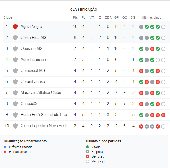 A classificação está sendo liderada por Águia Negra com 10 pontos, seguida do Costa Rica com 8 pontos, na terceira posição está o Operário com 7 pontos, Aquidauanense também com 7 pontos e Comercial com 4 pontos.