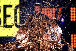 O "slime" que cobriu Beckham, porém, não foi da tradicional cor verde, mas dourado - uma possível referência ao apelido do ex-jogador na Inglaterra, "Goldenballs" (bolas douradas). O antigo astro de Manchester United e Real Madrid levou um susto, mas logo voltou a sorrir para as câmeras. Seu filho mais novo Cruz, porém, não pareceu nada satisfeito com o banho.