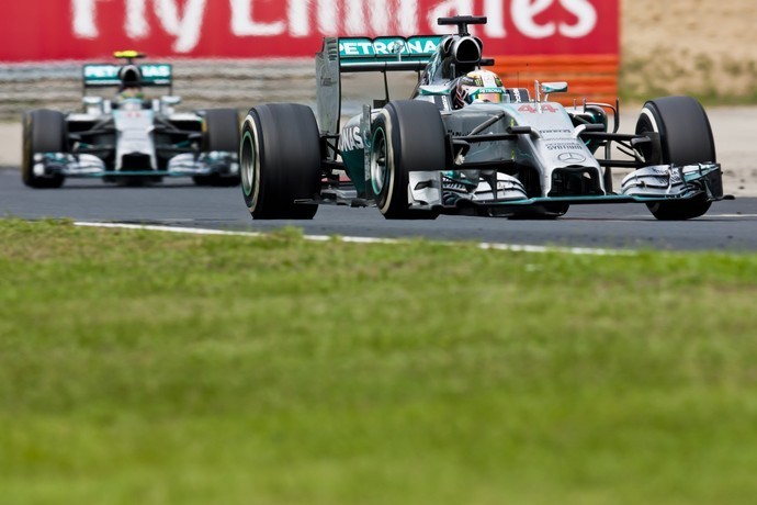 Lewis Hamilton segura Nico Rosberg no GP da Hungria de Fórmula 1. (Foto: Getty Images)