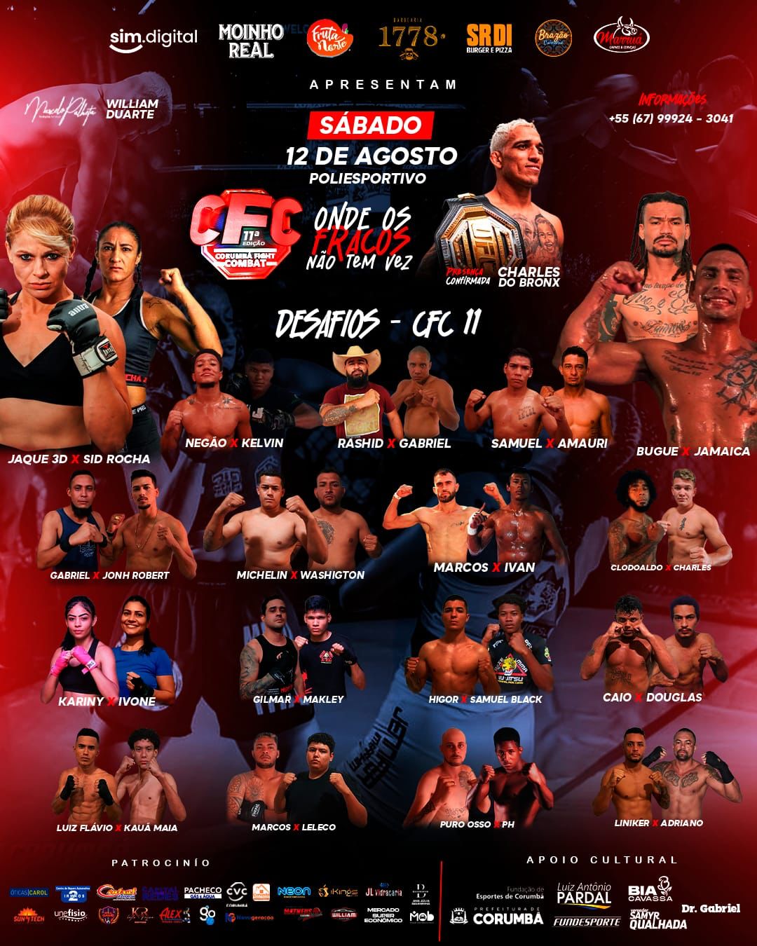 Corumbá recebe no próximo dia 12 de agosto, o 11º Corumbá Fight Combat de MMA (artes marciais mistas). O evento será no Centro Poliesportivo Municipal, na Popular Velha, na cidade de Corumbá, a 428 km de Campo Grande.
