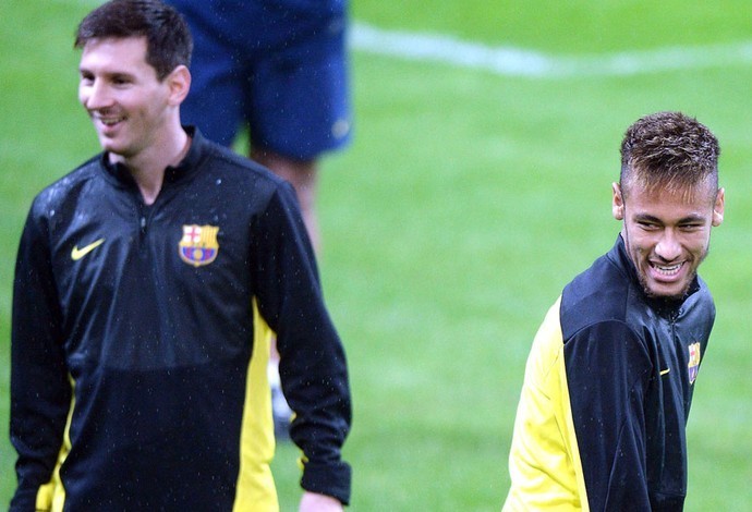 Messi e Neymar brincam no treino do Barcelona em Milão. (Foto: Agência EFE)
