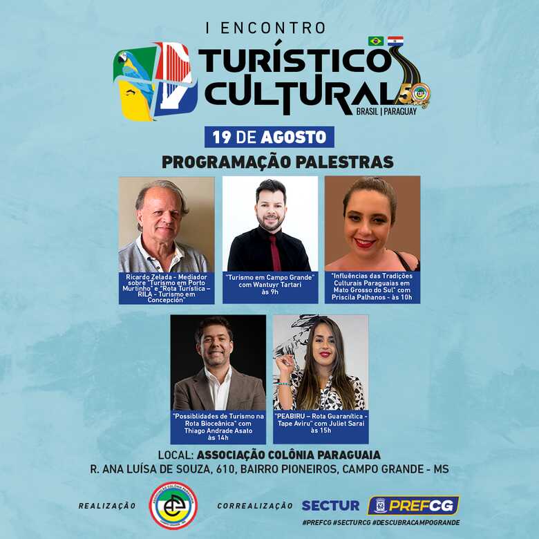 A programação do evento começa com uma breve explanação sobre a Rota Turística - RILA - Rota Bioceânica, feita pelo diretor cultural da ACP, Ricardo Zelada, seguida pela palestra “Turismo em Campo Grande”, ministrada pelo superintendente de Turismo de Campo Grande, Wantuyr Tartari. Wantuyr atua há 24 anos na gestão pública de Campo Grande ”.