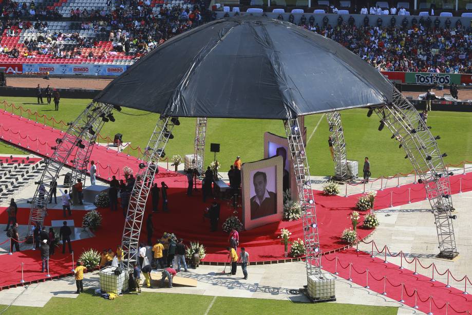 Criador de Chaves e Chapolin com personagens marcantes de programas que até hoje são veiculados, o comediante morreu aos 85 anos, vítima de uma parada cardíaca. Ele já vinha sofrendo de problemas respiratórios crônicos e tinha mobilidade reduzida. O velório aconteceu no estádio Azteca, como mostra a imagem abaixo: