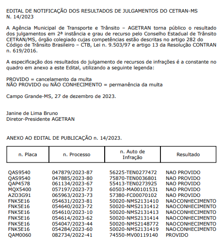 A publicação detalhada dos resultados pode ser consultada no Edital de Notificação dos Resultados de Julgamentos do CETRAN-MS, número 14/2023, disponível a partir da página 14 do Diogrande.