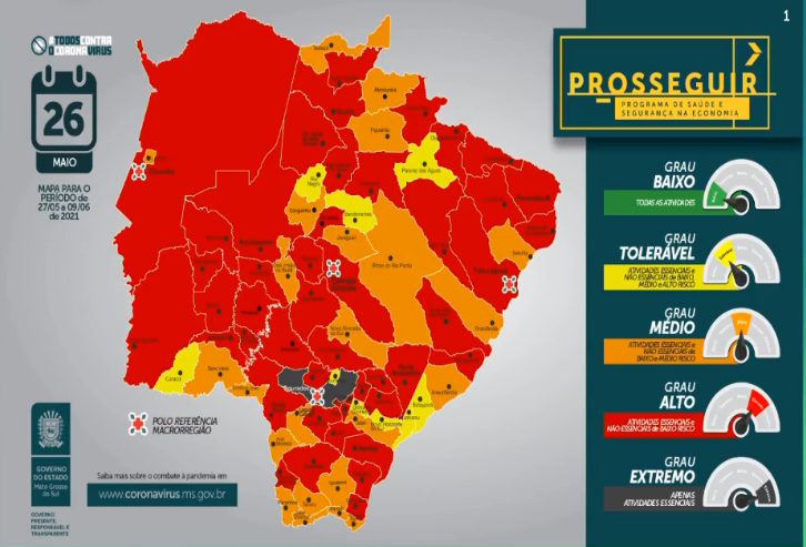 Além de Campo Grande, outras 45 cidades estão classificadas na bandeira vermelha. 23 municípios em laranja [grau médio] e apenas 9 foram classificados na bandeira amarela [grau tolerável]. Nenhuma cidade de MS consta na bandeira verde, grau baixo de contágio para o vírus.