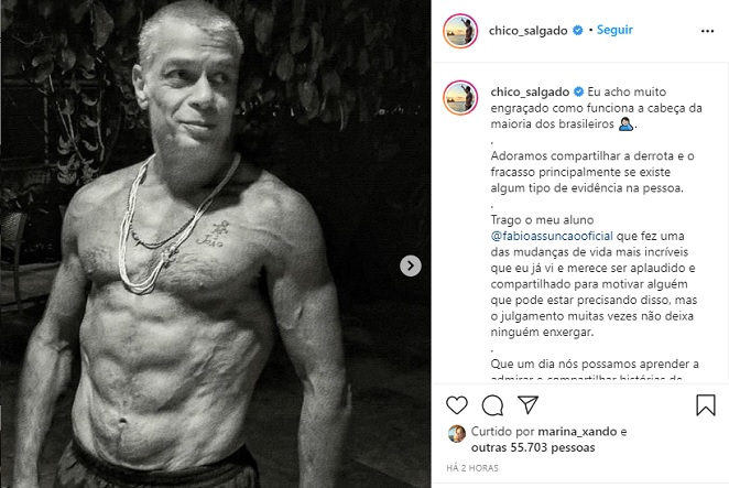 Em seguida, Chico pediu mais empatia. "Que um dia nós possamos aprender a admirar e compartilhar histórias de vitória e superação e isso tenha mais destaque do que qualquer meme sem noção. Ainda bem que o Fábio usou todas as críticas para converter em energia e vontade de mudar. Esse foi o trampolim para ressurgir na sua melhor versão! PS: Não é bomba, dieta milagrosa nem mágica. São dez meses de trabalho duro que começou com uma coisa chamada decisão", finalizou ele.