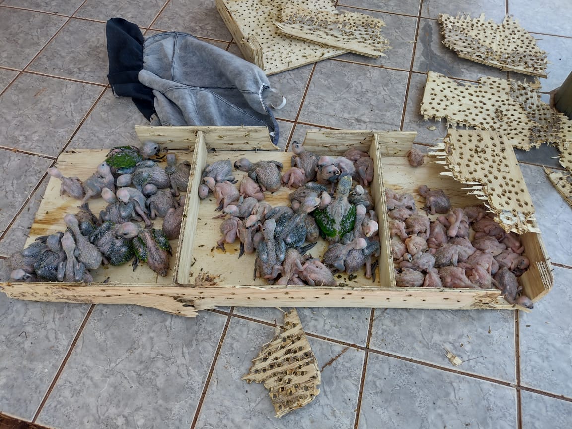 A Polícia Militar Ambiental (PMA) de Batayporã abordou em flagrante no domingo (17), no entroncamento das rodovias MS-141 e MS-473, em Nova Andradina, um casal, do interior do estado de São Paulo, que trafegavam em um veículo transportando 79 filhotes de papagaio verdadeiros, de vários tamanhos, em uma caixa de madeira.