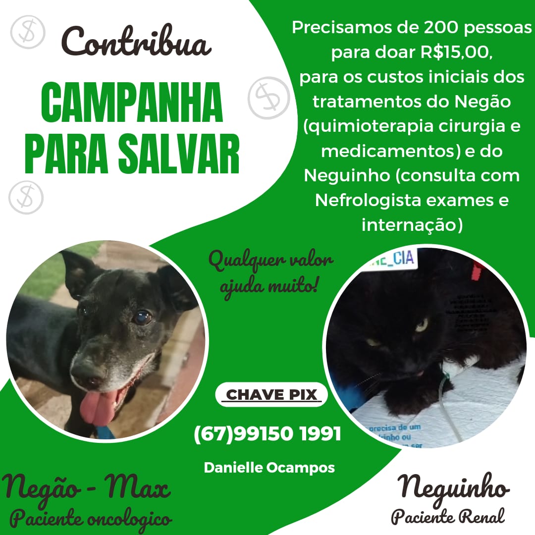 Dois pets precisam de ajuda para tratamentos de saúde, em Campo Grande. Um se trata de um cachorro, chamado Negão/Max, e o outro um gato, chamado Neguinho. Para custear as despesas veterinárias, a tutora pede doações para ajudar na causa.