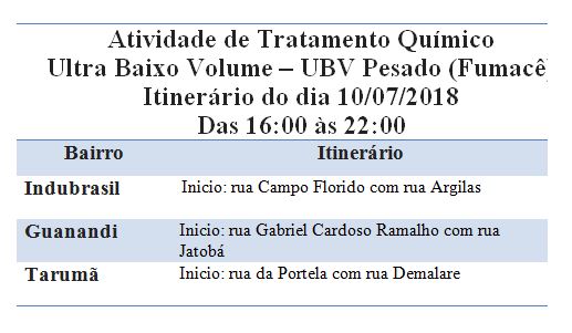 Os bairros Indubrasil, Guanandi e Tarumã serão atendidos nesta terça-feira (10) pelo serviço de borrifação Ultra Baixo Volume (UBV) – Fumacê – no combate ao mosquito Aedes aegypti – transmissor da dengue, zika e chikungunya.