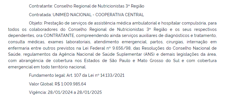 O Conselho Regional de Nutricionistas da 3ª Região (SP/MS) divulgou hoje, terça-feira (23), no Diário Oficial da União, a assinatura de um contrato de plano de saúde para seus membros.