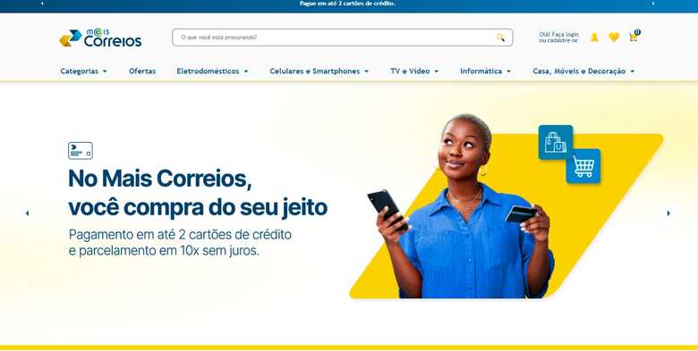 Uma nova plataforma de compra e venda com ampla variedade de produtos está disponível por meio digital, é a 'Mais Correios' que entrou no ar nesta terça-feira (1°) e já possui 500 mil produtos e 25 categorias incluindo eletrodomésticos, informática, moda, construção, entre outros.