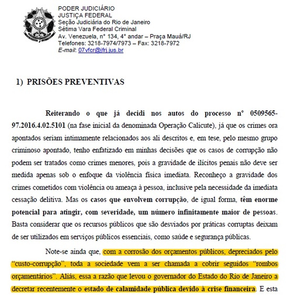 A corrupção é um dos motivos que levou o Estado do Rio a decretar calamidade pública. É o que conclui o magistrado Marcelo Brêtas, da 7ª Vara Federal Criminal, na decisão judicial em que determina a prisão do ex-governador Sérgio Cabral (PMDB) e a do empresário Eike Batista, fruto da Operação Eficiência, desencadeada nesta quinta-feira (26). No total, foram pedidas 9 prisões preventivas.