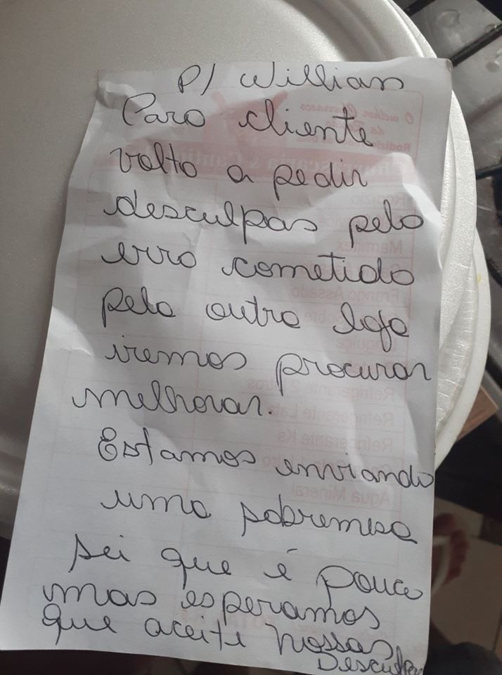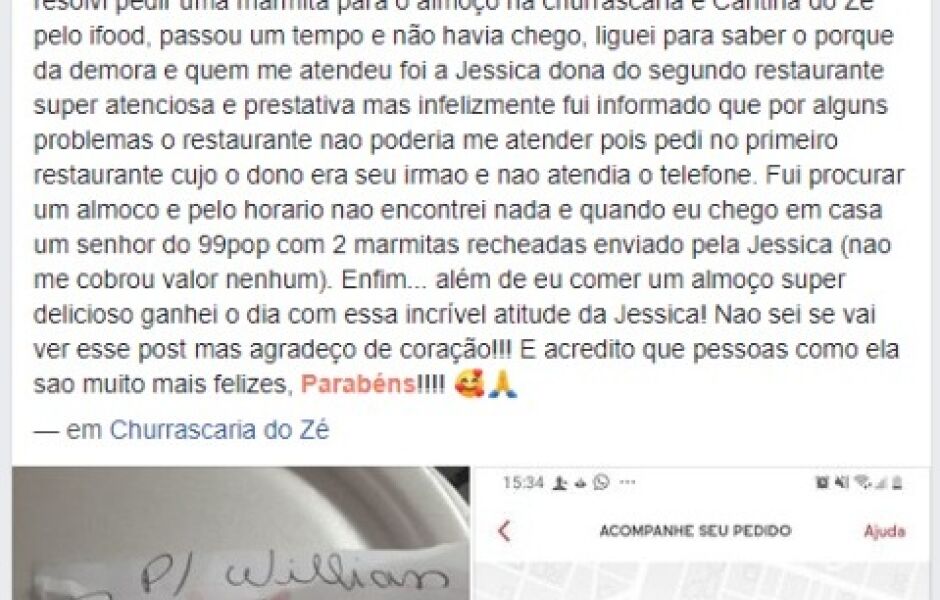 Willyan terminou a postagem elogiando a refeição e divulgando o ato, que apesar de ser simples, o deixou muito comovido por ter um tratamento ao cliente diferenciado.