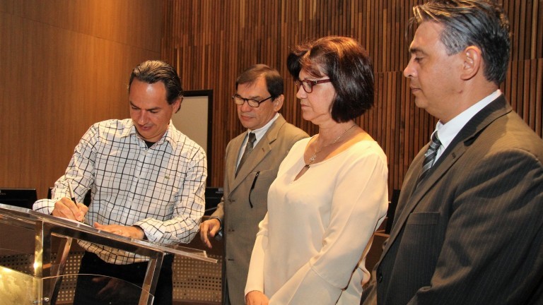 O “Projeto Educação, Trabalho e Justiça” promove audiências simuladas, palestras e visitas em escolas e nas unidades da Justiça do Trabalho de Mato Grosso do Sul. O acordo foi assinado nesta manhã pelo prefeito Marquinhos Trad, o presidente do TRT, João de Deus Gomes de Souza, e os titulares da Funsat, Cleiton Freitas Franco e da Semed, Ilza Mateus.