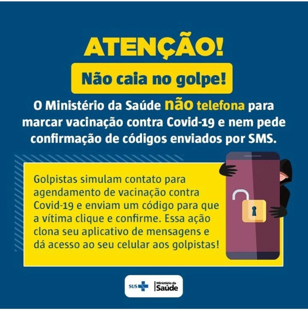 “O Ministério da Saúde alerta para um novo golpe em nome do órgão. A ação visa clonar seu número do aplicativo de mensagens e ter acesso aos dados do seu celular. Não caia nessa". A pasta não telefone para marcar vacinação e jamais pede este tipo de confirmação de dados.