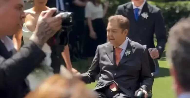 O apresentador Faustão, de 75 anos, apareceu de cadeira de rodas no casamento de sua filha, Lara Silva neste sábado (20), após receber alta hospitalar quase um mês após três meses de internação em São Paulo.