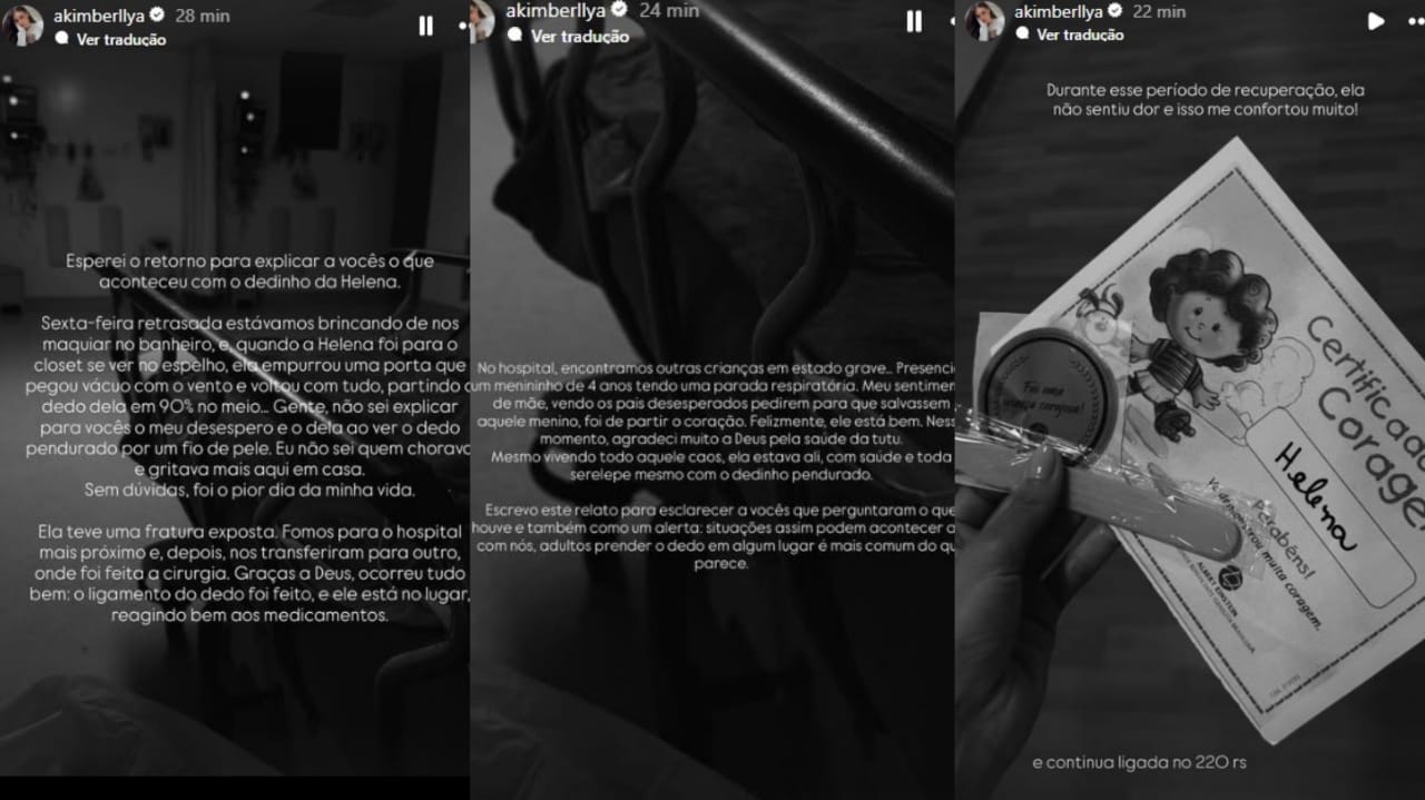 Por meio de um pronunciamento feito nos Stories do seu perfil do Instagram, a modelo declarou que esperou o retorno para explicar o que havia acontecido. "Esperei o retorno para explicar a vocês o que aconteceu com o dedinho da Helena. Sexta-feira estávamos brincando de nos maquiar no banheiro e, quando a Helena foi para o closet se ver no espelho, ela empurrou uma porta que pegou vácuo com o vento e voltou com tudo, partindo o dedo dela em 90% no meio".