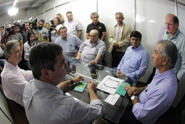 O governador Reinaldo Azambuja cumpre expediente de trabalho no Parque de Exposições Laucídio Coelho nesta terça-feira (4), onde é realizada a 79° Expogrande – uma das maiores feiras agropecuárias do Centro-Oeste. No local está instalado um gabinete itinerante do Governo do Estado.