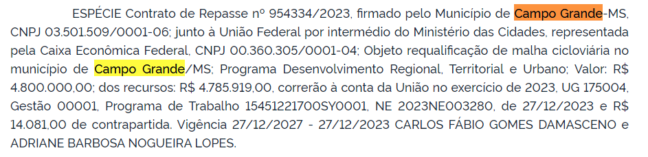 Nesta quarta-feira (03), o Diário Oficial da União divulgou um extrato de contrato de repasse destinado à requalificação da malha cicloviária em Campo Grande.