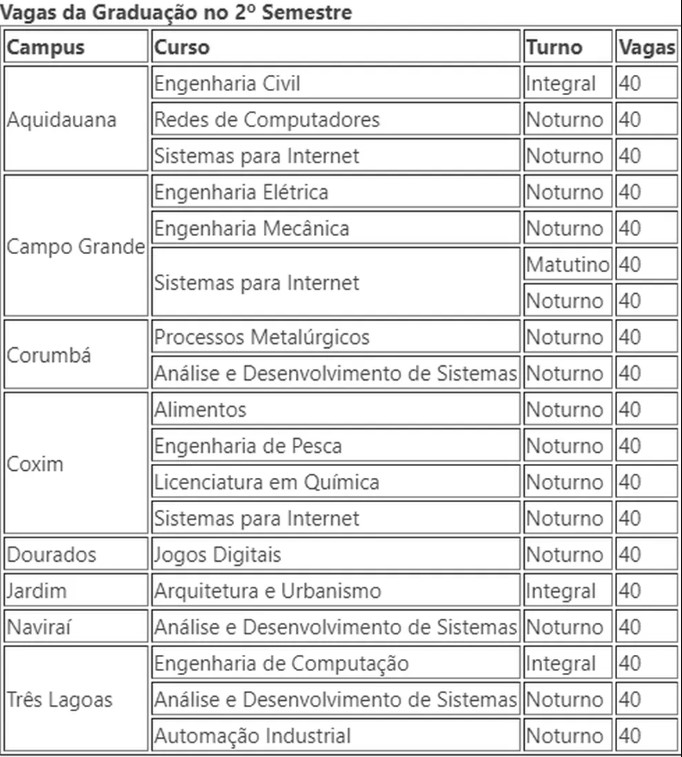 As vagas estão distribuídas nos municípios de Aquidauana (120 vagas), Campo Grande (160), Corumbá (80), Coxim (160), Dourados (40), Jardim (40), Naviraí (40) e Três Lagoas (120).
