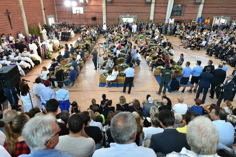 A cerimônia foi conduzida pelo bispo Giovanni D'Ercole num ginásio poliesportivo da região, onde foram colocados 35 caixões adornados com flores. Além de políticos, familiares de vítimas, cidadãos e participantes dos trabalhos de resgate também compareceram.