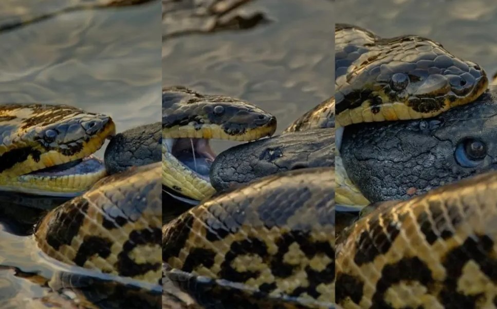 Nas imagens é possível ver a sucuri predando o peixe por meio da técnica "estrangulamento". Para se alimentar da presa, a cobra se enrolou ao redor do peixe, mas não conseguiu terminar a refeição. O avistamento aconteceu em outubro de 2022, durante um safári no Refúgio Ecológico Caiman.