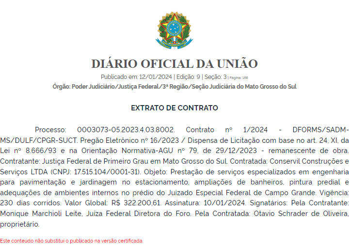 Nesta sexta-feira, 12 de janeiro, o Diário Oficial da União publicou um extrato de contrato firmado entre o Tribunal Regional Federal da 3ª Região (TRF3) e a empresa Conservil Construções e Serviços LTDA para a realização de obras no prédio localizado em Campo Grande.