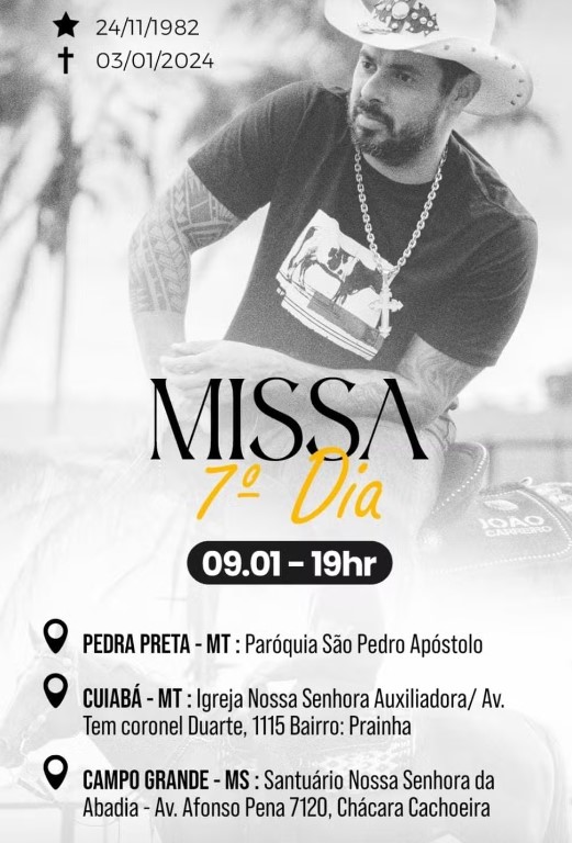 A missa de 7º dia do cantor João Carreiro será realizada às 19h desta terça-feira (9), nos dois estados que o cantor nasceu e viveu a maior parte da vida, Mato Grosso e Mato Grosso do Sul. As cerimônias serão simultâneas, nas cidades de Campo Grande (MS), Cuiabá (MT) e Pedra Preta (MT).