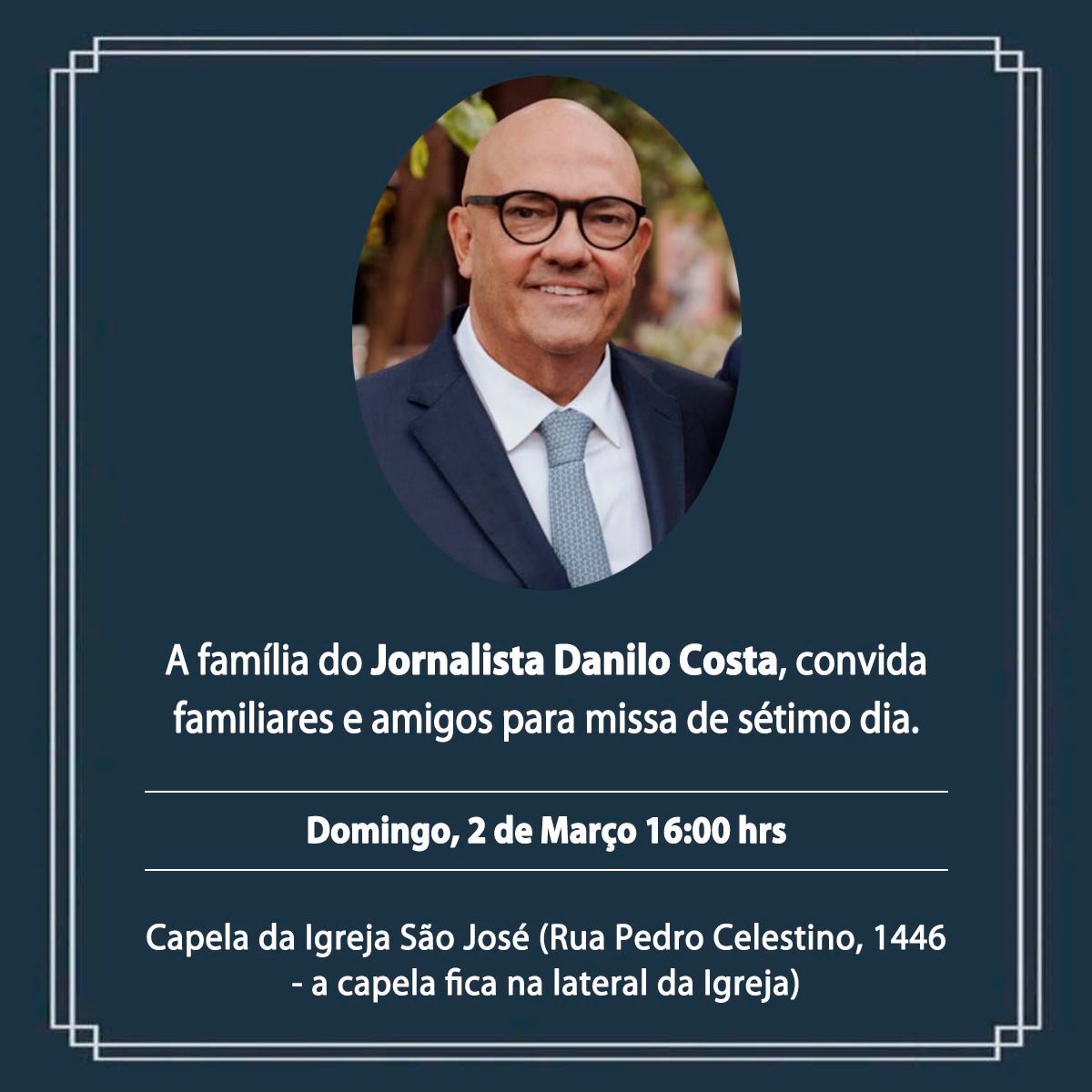 A Missa de Sétimo Dia do jornalista e também empresário Danilo Pereira da Costa, de 61 anos, será realizada às 16h do domingo (2).