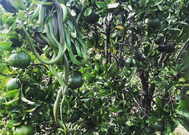 Tenebroso! Telmo Santos, residente de Santo Antônio da Patrulha, no Rio Grande do Sul, andava por uma propriedade quando avistou uma cena curiosa e um tanto bizarra. Em um pé de mexericas, Santos viu um ‘cacho’ de cobras da espécie Philodryas olfersii.