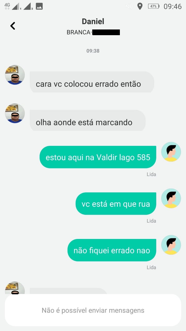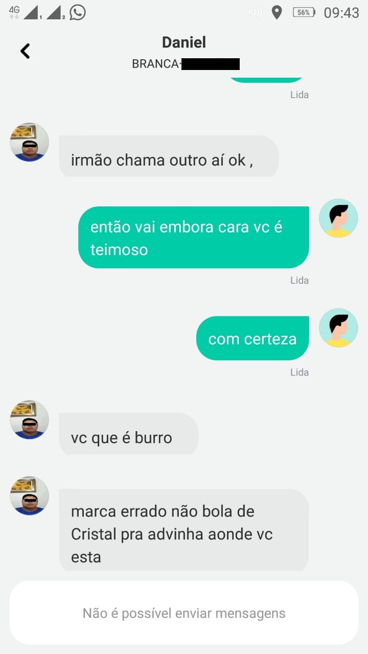 Em outro print, o motorista diz "irmão chama outro ai ok" (ele faz referência a chamar outro motorista), em seguida Carlos escreve, "então vai embora você é teimoso", ai neste momento Daniel fala "você que é burro", e fala que não tem bola de cristal para adivinhar onde estaria o idoso.