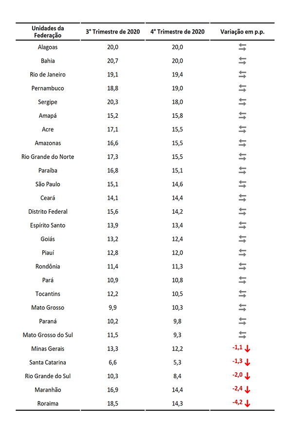 Frente ao trimestre anterior, a taxa de desocupação caiu em cinco unidades da federação, com estabilidade nas demais. As maiores quedas foram em Roraima (4,2 p. p.) e Maranhão (2,5 p. p.), e as menores taxas de desocupação são em Santa Catarina (5,3%), Rio Grande do Sul (8,4%), Mato Grosso do Sul (9,3%) e Paraná (9,8%), as únicas abaixo de 10,0%.