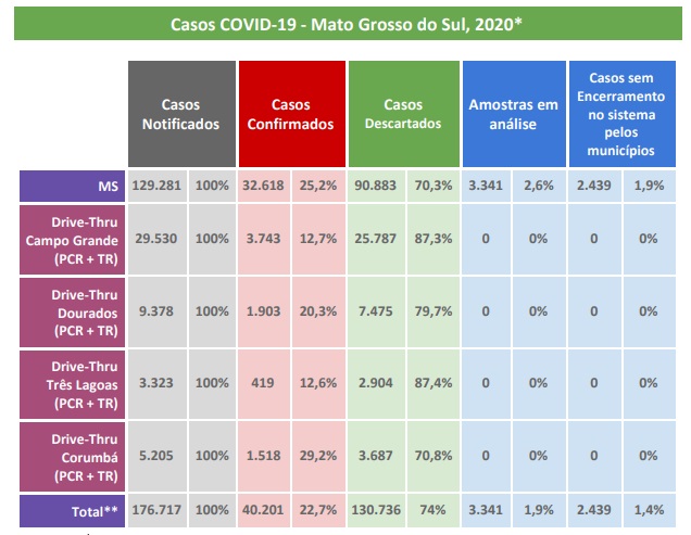 Conforme o boletim, MS já soma 129.281 casos notificados, dos quais 90.883 foram descartados. Há 3.341 amostras em análise no Lacen-MS (Laboratório Central de MS) e 2.439 casos ainda aguardam encerramento pelos municípios.