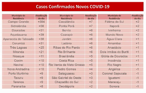 Os 820 novos casos de Covid-19 estão distribuídos em 48 municípios. A maior parte dos casos são de Campo Grande que registrou (394), em Sidrolândia foram (56) novos registros, na sequencia vem Dourados com (51), Aquidauana com (39), Aparecida do Taboado com (38), Corumbá com (31), Três Lagoas com (25), Miranda com (21), Nioaque teve (11), Coxim com(10), Naviraí com (10) e Nova Andradina (10). Confira na tabela abaixo, todos os outros municípios que tiveram casos registrados.