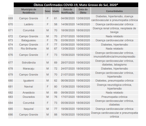 Nas últimas 24 horas foram registrados 18 óbitos, desses 6 foram em Campo Grande, 2 em Corumbá, os municipios que tiveram um óbito foram Ladário, Bataguassu, Rio Brilhante, Sidrolândia, Maracaju, Iguatemi, Naviraí, Anastácio, Dourados e Itaquiraí.