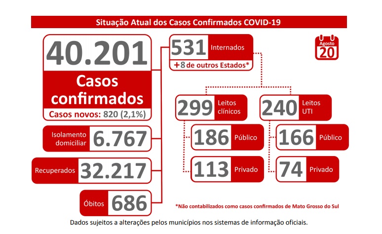 Mato Grosso do Sul registrou nas últimas 24 horas, 820 novos casos de Covid-19, conforme divulgado nesta quinta-feira (20) no boletim epidemiológico do novo coronavírus. O total de infectados em MS chegou a 40.201, com registro de 18 óbitos nas últimas 24 horas. Os 820 novos casos refletem incremento de 2,1% na curva, conforme a SES (Secretaria de Estado de Saúde).