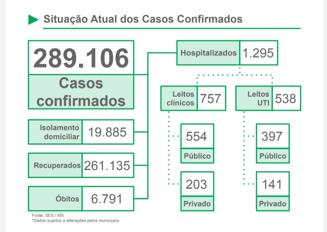 Os maiores números de novos casos são de Campo Grande com 534, Dourados 312, Corumbá 74, Três Lagoas 66, Ponta Porã 87 casos.