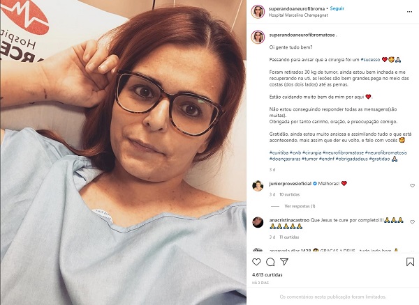 Karina Rodini passou por uma cirurgia no dia 16 de novembro no Hospital Marcelino Champagnat, em Curitiba (PR), para a retirada de mais de 30 quilos de tumores em suas pernas, após anos do diagnóstico - ainda na infância - de neurofibromatose, uma doença que não tem cura e nem tratamento específico comprovado.